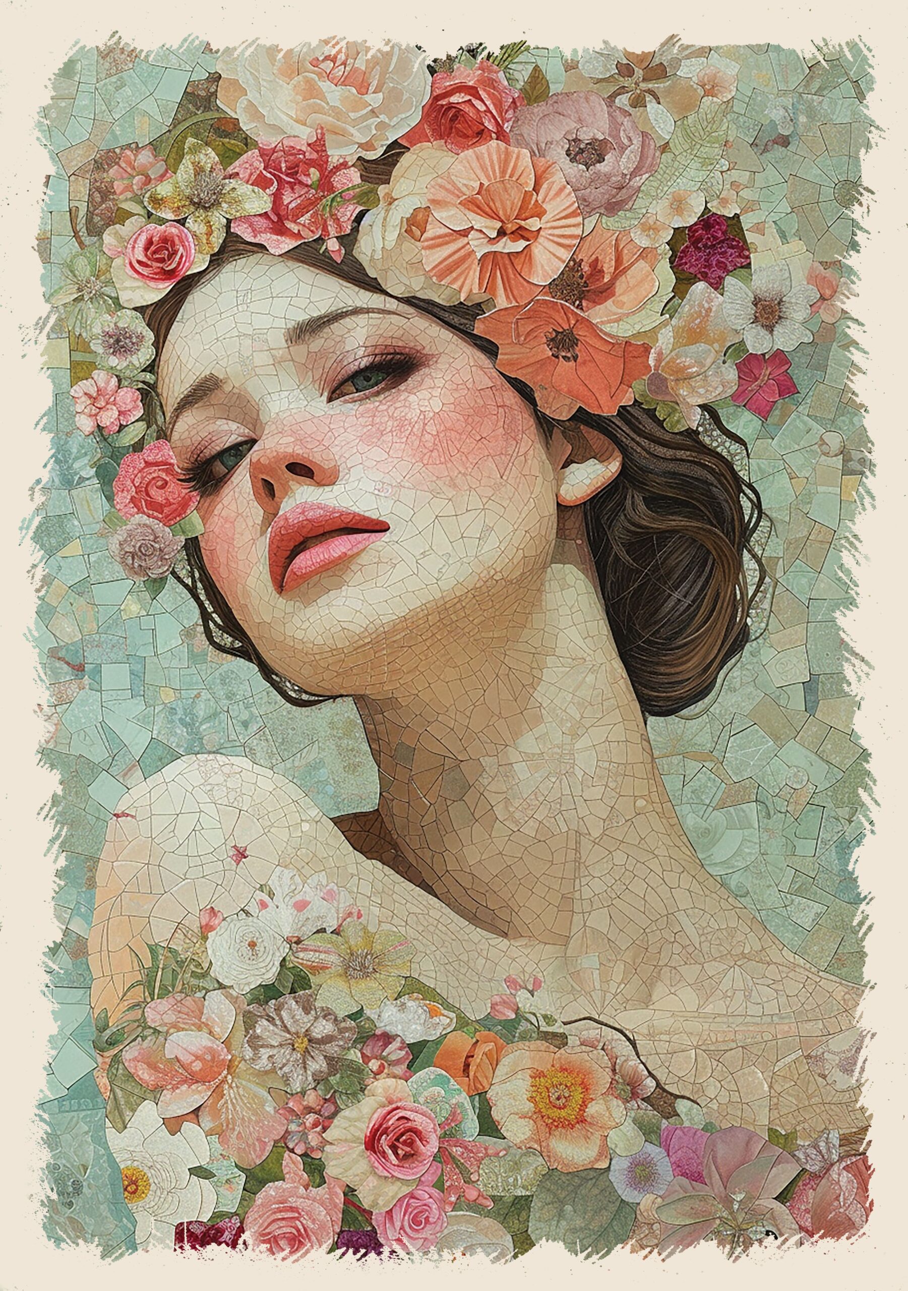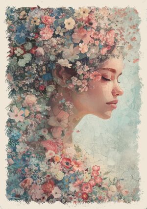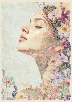 Plakat Zatrzymana Chwila przedstawia twarz pełną spokoju, otoczoną eterycznym pięknem kwiatów, które zdają się rozkwitać z samej jej istoty. Każdy