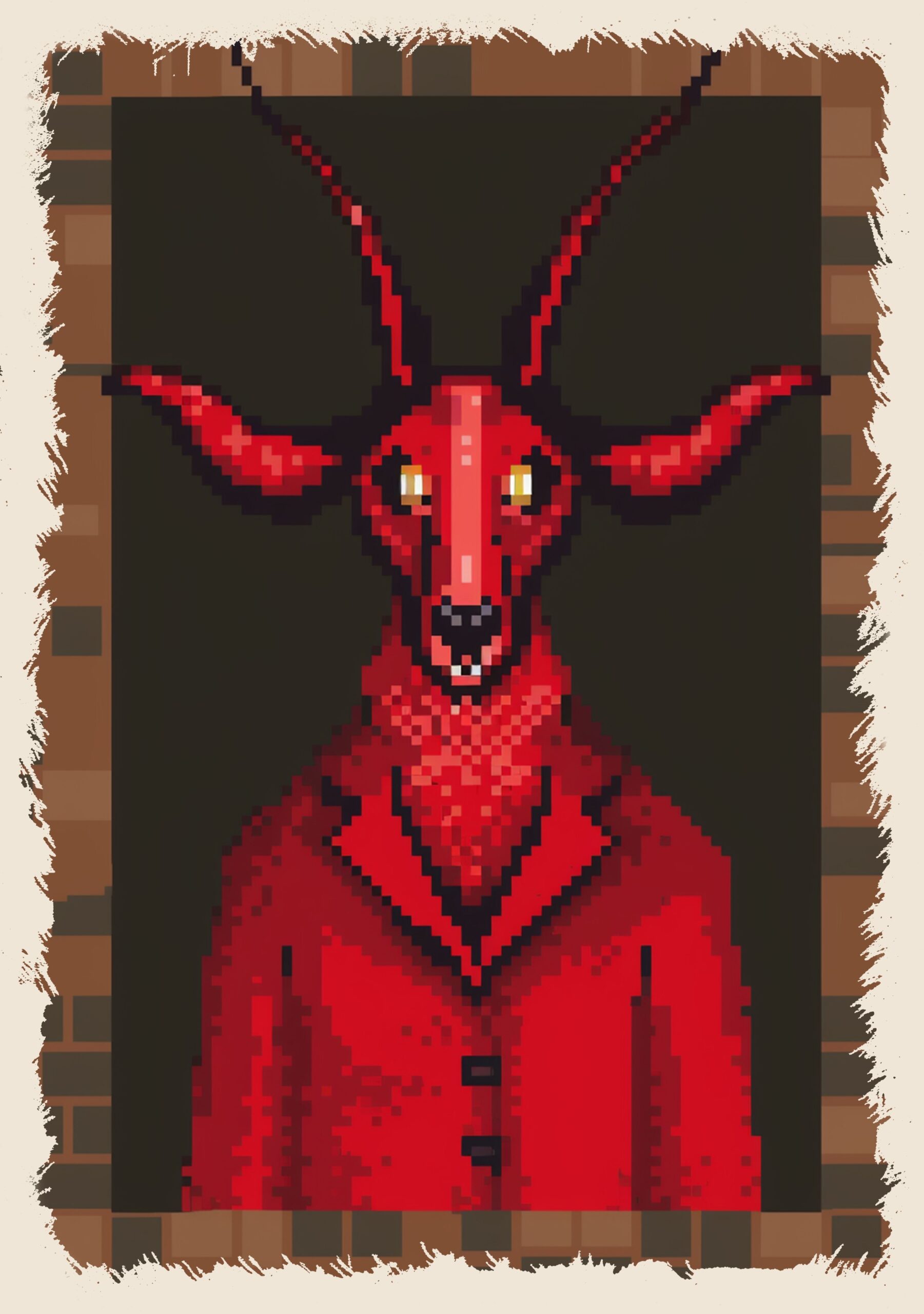 W świecie, gdzie tajemnica i surrealizm mieszają się z retro estetyką, pojawia się Diabelski Gość. Jego postać, z rogami wyłaniającymi się z ciemności i garniturem niczym z koszmarnego snu, przyciąga wzrok i wywołuje niepokój. To postać, która zdaje się pochodzić z pikselowego świata pełnego zagadek i mrocznych sekretów, gotowa rzucić wyzwanie każdemu, kto spojrzy na niego zbyt długo.