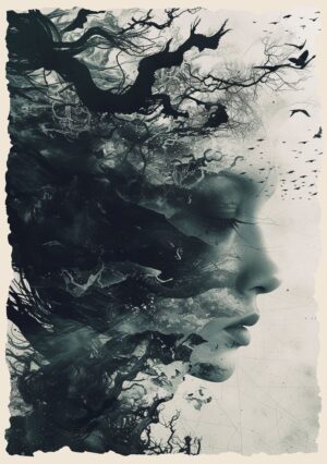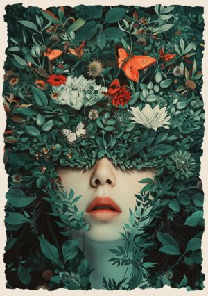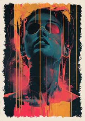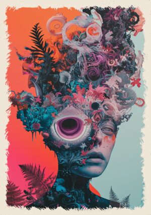 Zanurzony w mistycznych kolorach i abstrakcyjnych formach, plakat Kosmiczny Przepływ ukazuje twarz w stanie głębokiego transu, jakby była częścią niekończącej się podróży przez nieskończone wymiary. Linie i kształty przenikają się wzajemnie, tworząc dynamiczne fale, które przepływają przez jej ciało niczym kosmiczne energie. To obraz, który łączy w sobie zarówno spokój, jak i potężną, niepowstrzymaną siłę wszechświata, zatrzymaną w chwili wewnętrznej kontemplacji.