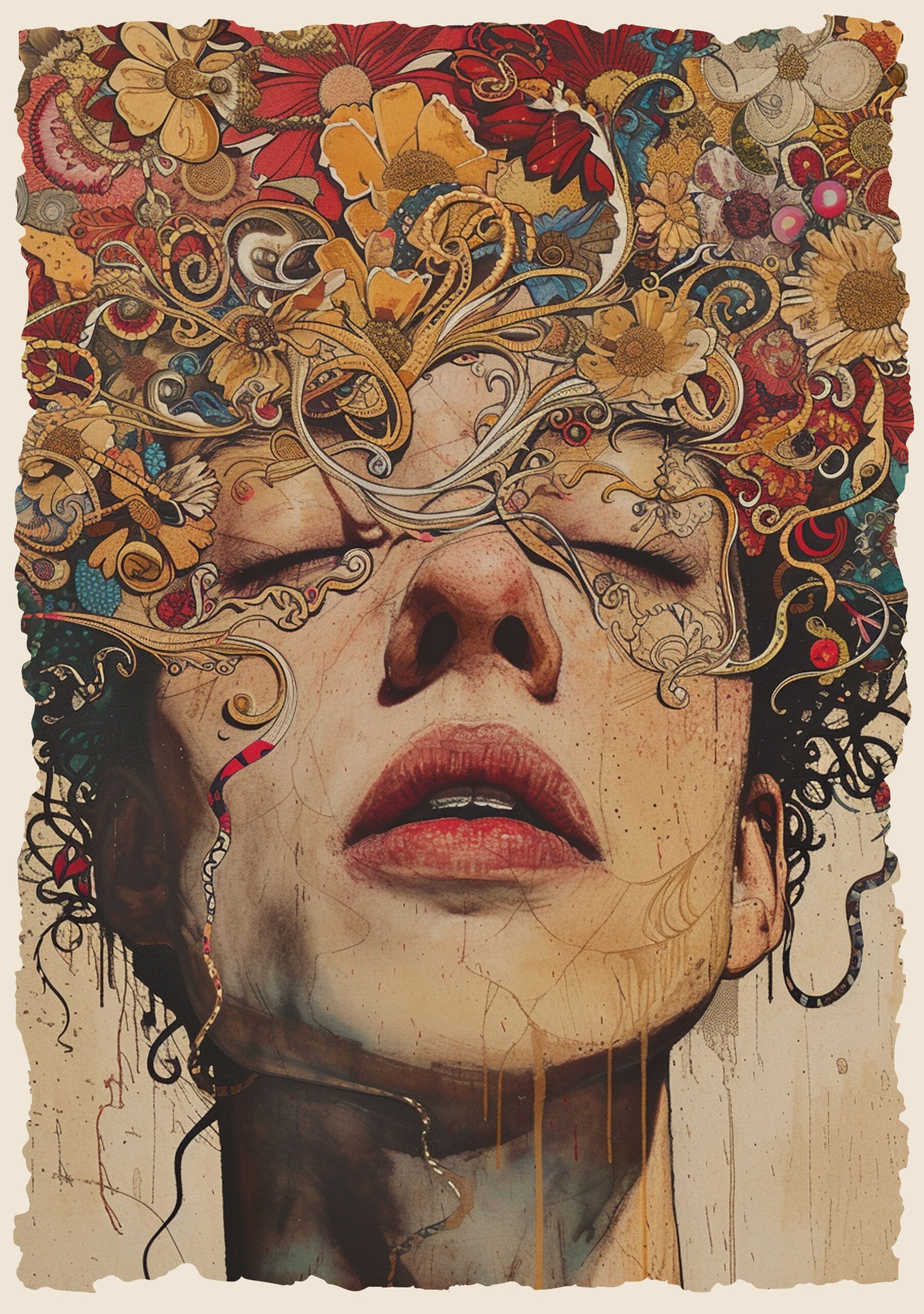 Zanurzona w głębokim transie, postać na plakacie Kwiatowy Trans zdaje się być pochłonięta przez wir barwnych, florystycznych wzorów, które eksplodują z jej wnętrza. Każdy detal kwiatów oplatających jej twarz tworzy surrealistyczną mozaikę emocji, przekształcając myśli w żywe obrazy. To intensywna podróż do wnętrza umysłu, gdzie natura i wyobraźnia splatają się w jedną, nieodłączną całość.