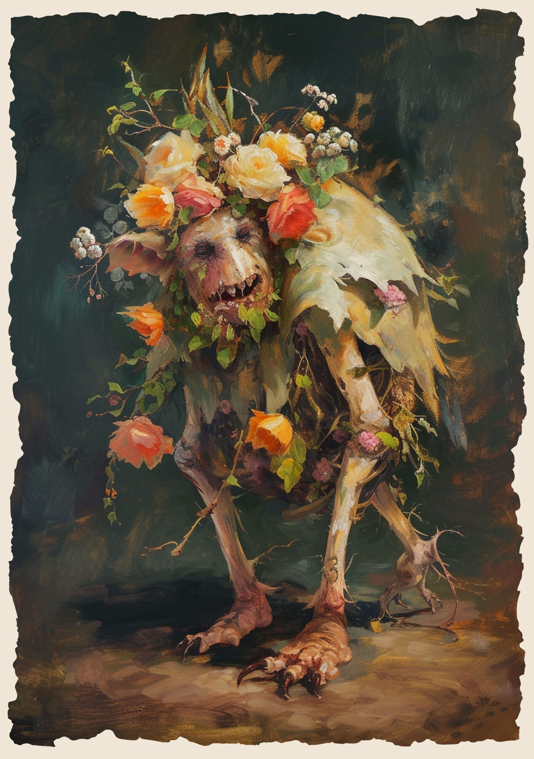W magicznych głębinach pradawnych lasów, gdzie każda istota kryje swoją tajemnicę, zamieszkuje Leśny Psotnik. Jego postać, choć na pierwszy rzut oka przerażająca, kryje w sobie nieco humorystyczny urok. Zęby, które wyglądają na nieco zbyt duże, i kwiaty wplecione w jego dziwaczną, liściastą sierść, tworzą obraz istoty, która zdaje się być uosobieniem leśnych figli i psot.