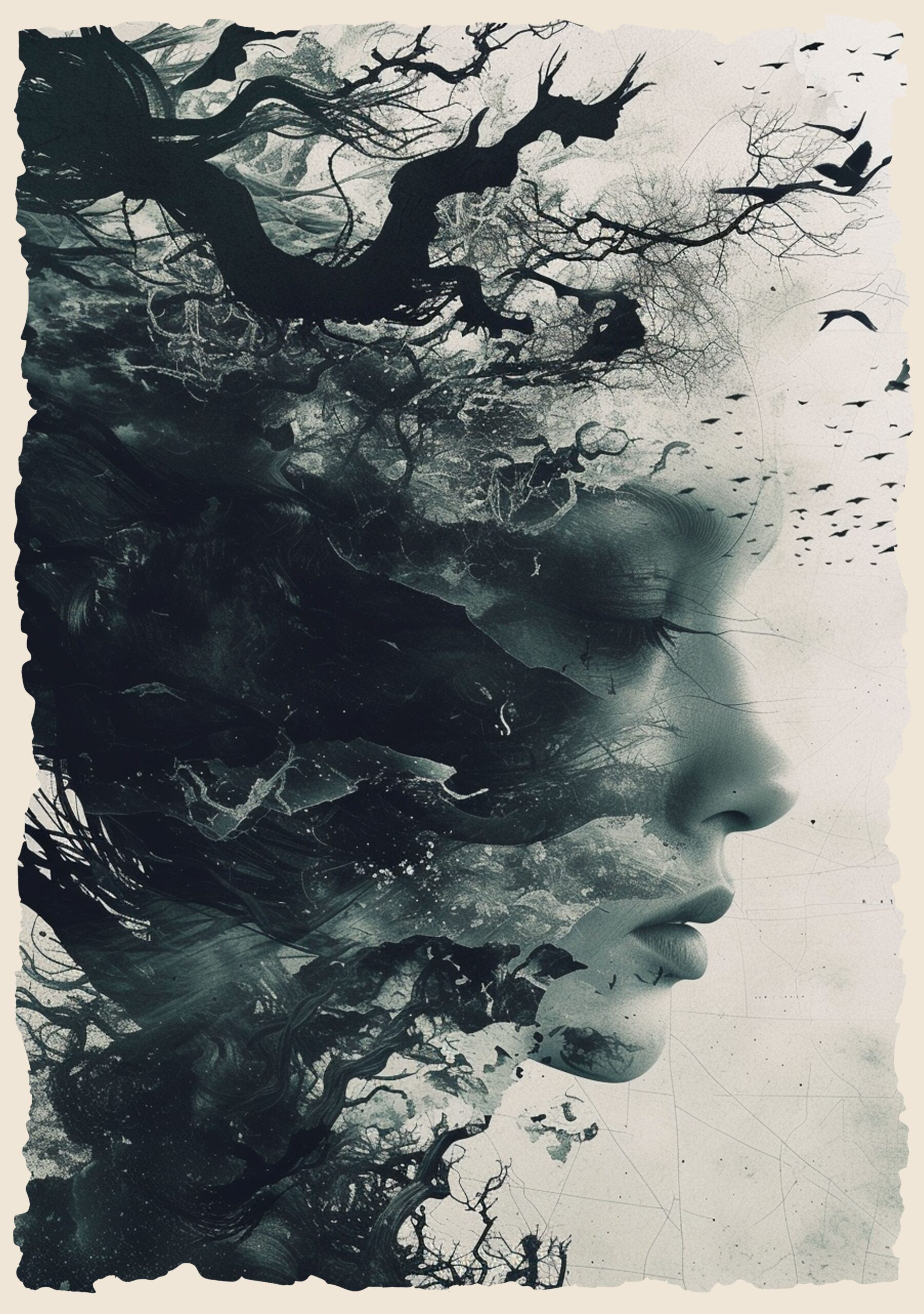 W gęstej mgiełce, gdzie cienie i światło splatają się w jedno, plakat Mroczny Sen ukazuje twarz zanurzoną w otchłani tajemniczych myśli. Gałęzie drzew i plątanina ciemnych form zdają się wyrastać z jej wnętrza, tworząc surrealistyczny krajobraz snu, w którym czas i przestrzeń tracą swoje znaczenie. To obraz, który wprowadza w stan refleksji, pozwalając odkryć głęboko ukryte emocje i lęki.