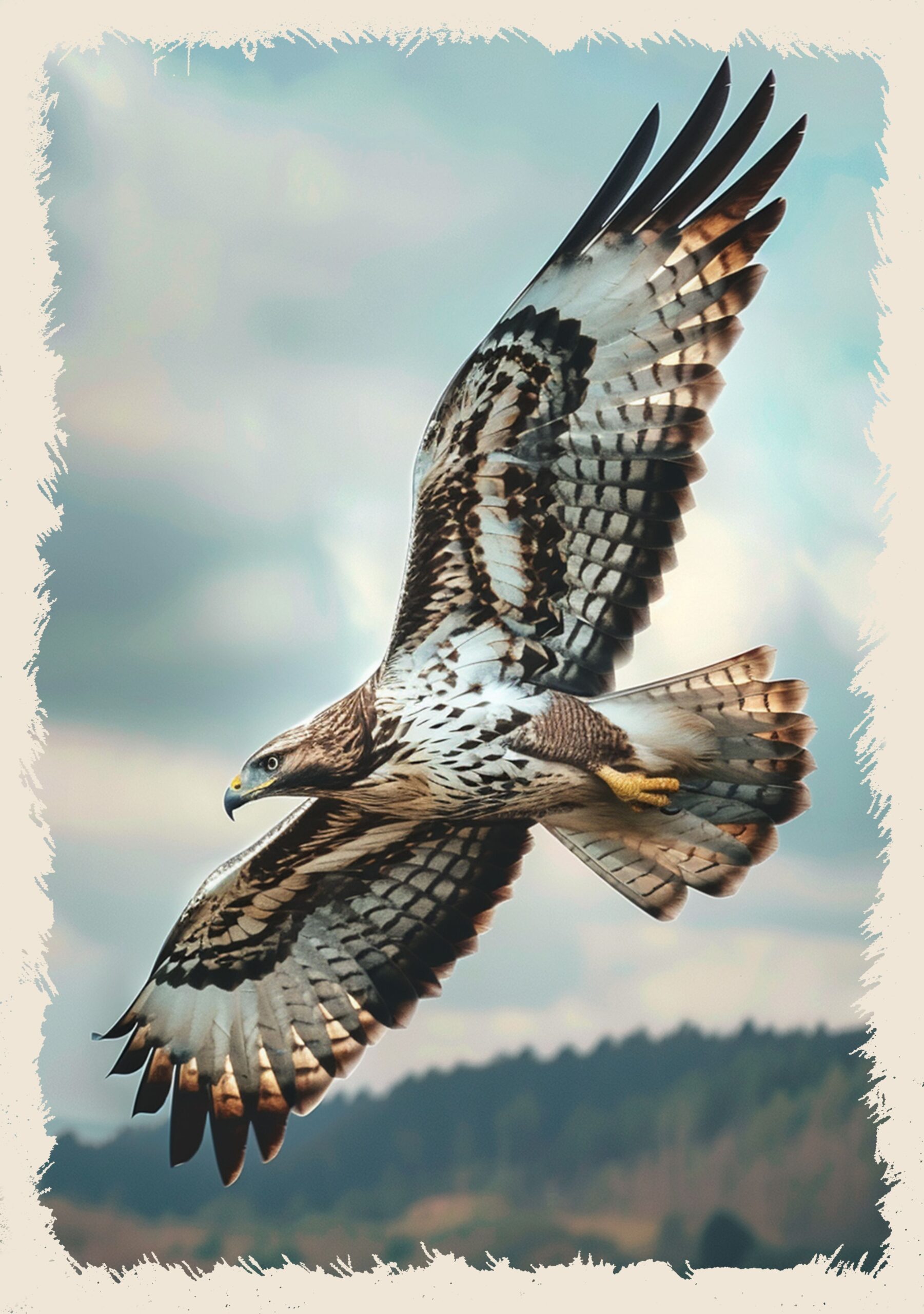 Nad rozległymi wzgórzami, gdzie niebo styka się z ziemią, majestatycznie szybują skrzydła Skrzydlatego Wędrowca. Jego ruchy są pełne gracji, a każdy lot to symbol nieposkromionej wolności, której nic nie ogranicza. Z wysokości obserwuje świat poniżej, a jego przenikliwy wzrok przeszywa przestrzeń, odnajdując każdy ruch wśród traw i lasów. To mistrz podniebnych łowów, który w harmonii z naturą pokonuje nieograniczone przestworza.