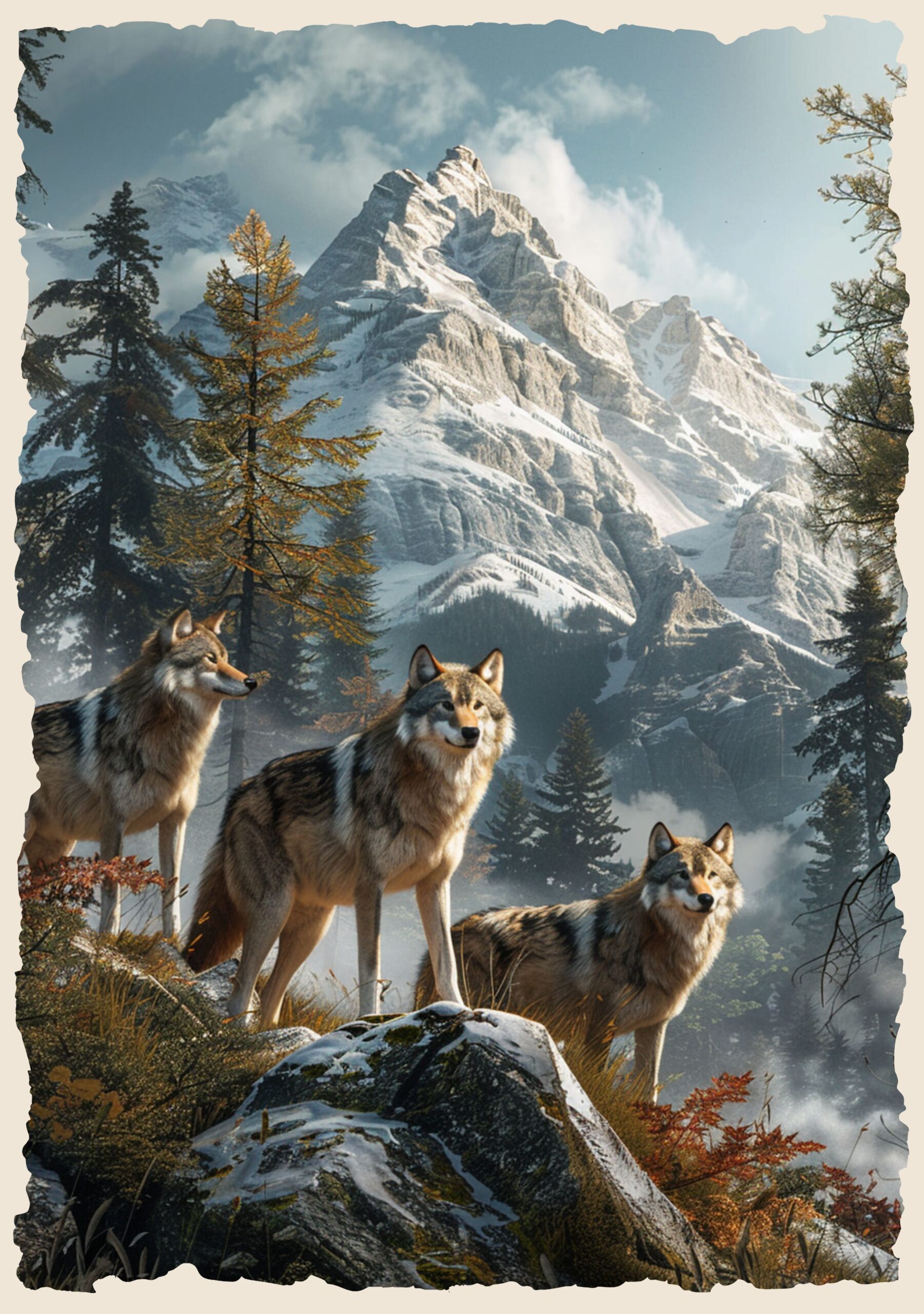 Wśród surowych, ośnieżonych szczytów, gdzie powietrze jest rześkie, a cisza przeszywa duszę, Strażnicy Gór pilnują swojego terytorium. Wataha wilków, symbol dzikiej siły i harmonii z naturą, przemierza tereny, na których każdy kamień i drzewo kryją tajemnicze historie. Ich spojrzenia są czujne, a kroki pewne, jakby były strażnikami pradawnych ścieżek, które prowadzą wprost do serca gór.