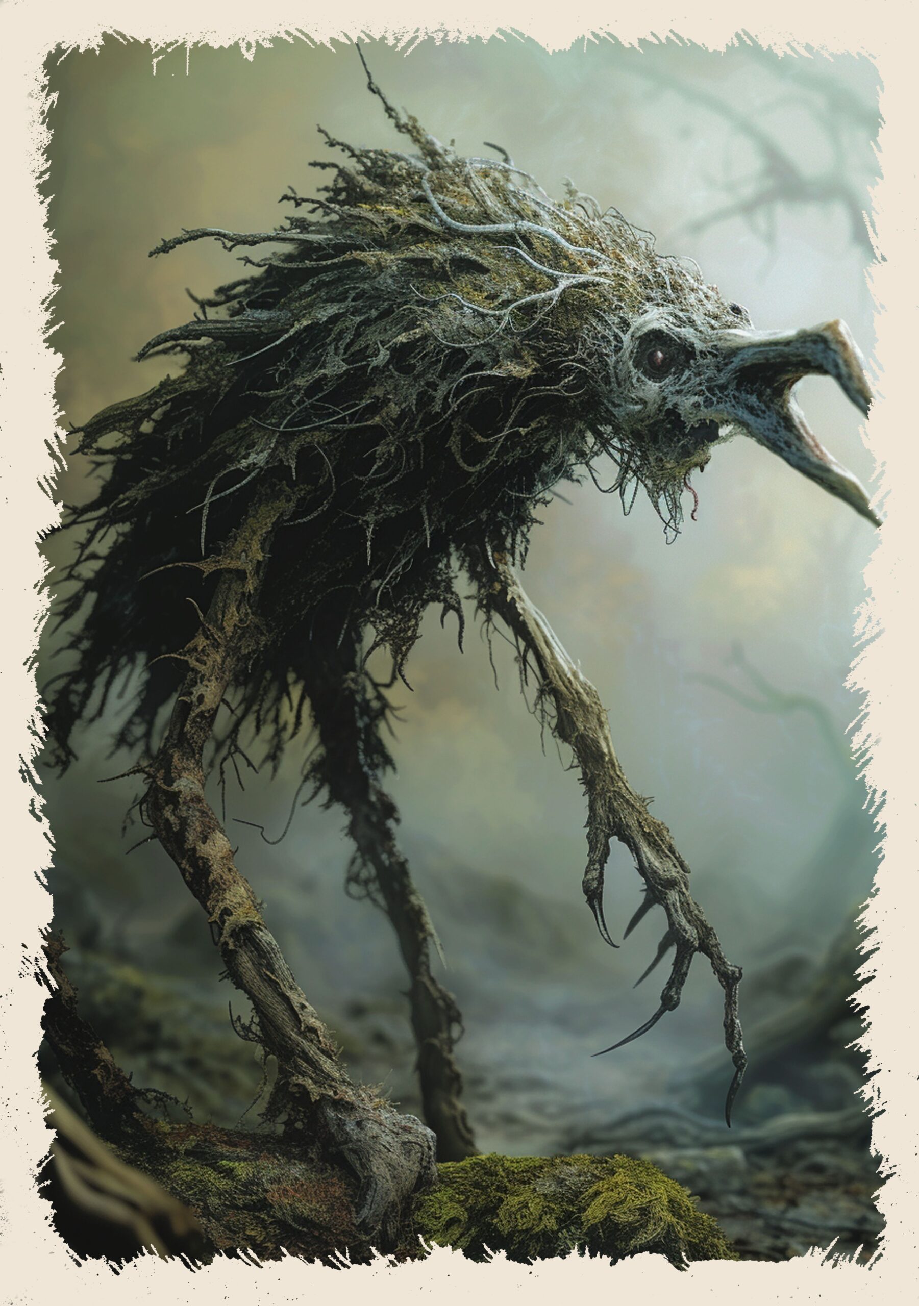W głębinach pradawnego lasu, wśród mgieł, które unoszą się niczym duchy dawnych czasów, kryje się Stworzenie Cienia Boru. To mityczne stworzenie, o ciele pokrytym korzeniami i mchem, zdaje się wyłaniać prosto z samego serca ziemi. Jego ostre, przerażające szpony i rozwarcie dzioba zwiastują, że jest ono strażnikiem zapomnianych tajemnic, gotowym bronić swojego terytorium przed nieproszonymi gośćmi.