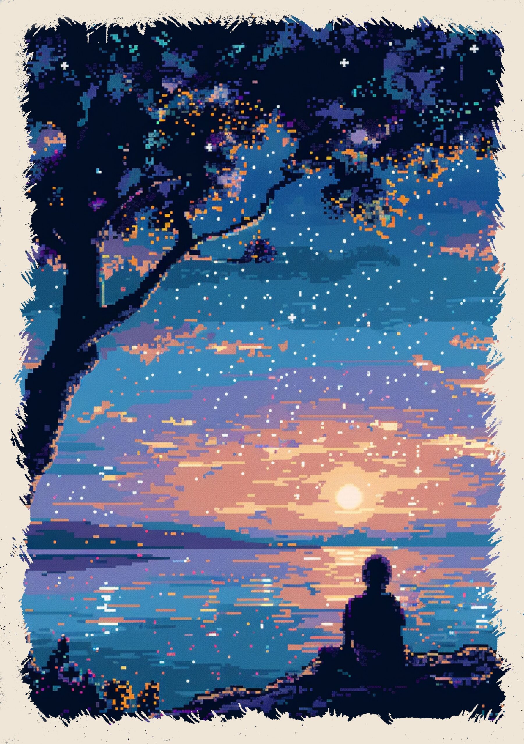 Gdzieś w pikselowej krainie, gdzie nocne niebo rozświetlają gwiazdy, a słońce powoli zanurza się w spokojnej tafli wody, rozciąga się Zachód Marzeń. To chwila pełna refleksji i spokoju, w której można zatopić się w pięknie prostych, cyfrowych krajobrazów. Każda gwiazda, każdy odcień nieba zdaje się opowiadać historię nostalgii i magii dawnych czasów.