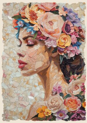 Plakat Kwiatowa Melodia ukazuje subtelne piękno kobiecości, otoczonej delikatnymi kwiatami, które zdają się żyć własnym życiem, oplatając jej twarz i
