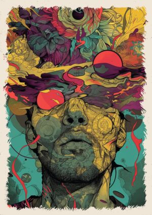 Zanurzony w mistycznych kolorach i abstrakcyjnych formach, plakat Kosmiczny Przepływ ukazuje twarz w stanie głębokiego transu, jakby była częścią niekończącej