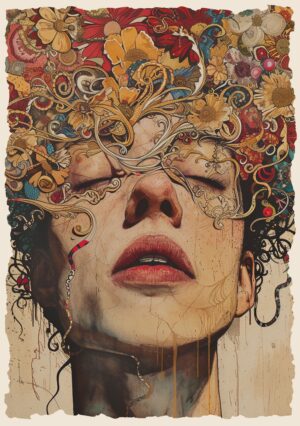 Zanurzona w głębokim transie, postać na plakacie Kwiatowy Trans zdaje się być pochłonięta przez wir barwnych, florystycznych wzorów, które eksplodują