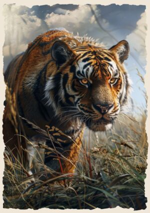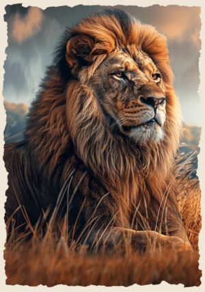 W sercu afrykańskiej sawanny, gdzie słońce rozlewa złote światło na rozległe trawy, spoczywa Król Sawanny. Jego dumny wzrok sięga daleko,